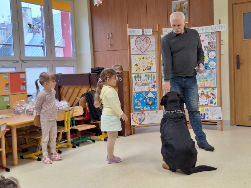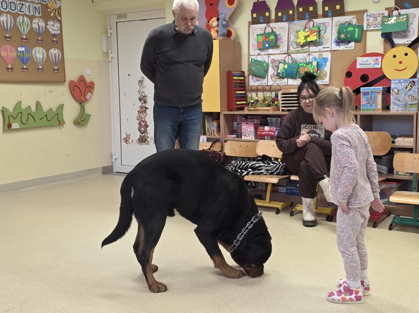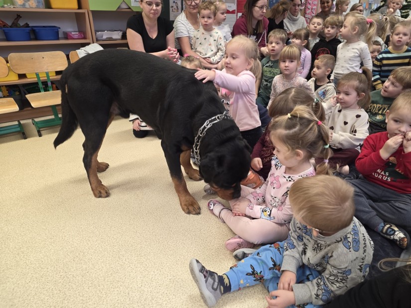 Spotkanie przyniosło dzieciom wiele emocji i cennych doświadczeń. Pan Jurek, pracujący na co dzień z psami, pokazał przedszkolakom, jak bezpiecznie podchodzić do czworonoga, jak go głaskać oraz jak reagować na jego zachowanie.